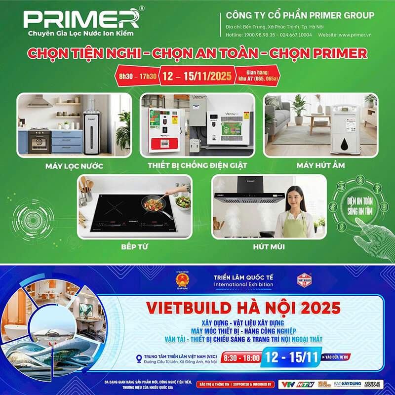 Trong khuôn khổ Vietbuild 2025, Primer Group – Chuyên gia Lọc Nước Ion Kiềm – sẽ trưng bày và giới thiệu một loạt các sản phẩm thiết yếu, mang tính đột phá về công nghệ và an toàn, bao gồm: